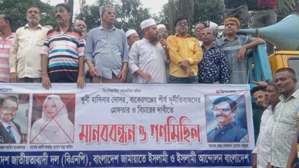 বাকেরগঞ্জের শীর্ষ দুর্নীতিবাজদের গ্রেফতার ও বিচারের দাবিতে মানববন্ধন ও বিক্ষোভ