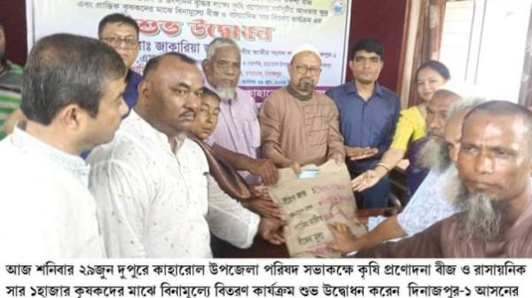 দিনাজপুর প্রতিনিধি : দিনাজপুরের কাহারোল উপজেলায় ২৯ জুন শনিবার সকাল ১১ টায় কৃষি সম্প্রসারণ অধিদপ্তরের আয়োজনে বিনা মুল্যে ১৬ শত কৃষকের মাঝে সার ও বীজ বিতরণ করেন দিনাজপুর -১ আসনের