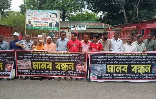 গোপালগঞ্জে সাংবাদিক পুত্র আরমান শেখ হত্যার বিচার দাবিতে সাংবাদিক ও এলাকাবাসীর মানববন্ধন