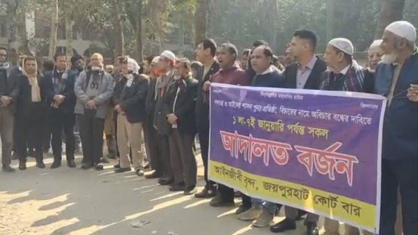 ফারহানা আক্তার, জয়পুরহাট : গণতন্ত্র ও আইনের সুশাসন পূর্ণ প্রতিষ্ঠা, বিচারের নামে অবিচার বন্ধের দাবিতে জয়পুরহাটে ১ জানুয়ারি থেকে ৭ জানুয়ারি পর্যন্ত আদালত বর্জনের ৩য় দিনের প্রতিবাদ কর্মসূচি করেছে জেলা