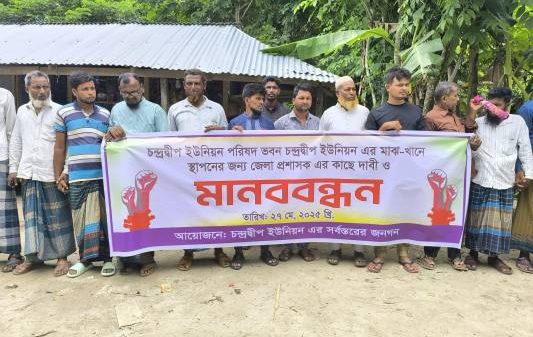 কহিনুর বেগম,পটুয়াখালী :পটুয়াখালী জেলার বাউফল উপজেলার চন্দ্রদ্বীপ ইউনিয়ন পরিষদ ভবনটি ইউনিয়নের কেন্দ্রস্থলে স্থাপন করার দাবিতে এলাকাবাসী মানববন্ধন করেছেন। ২৭.০৫.২৫ইং তারিখ রোজ মঙ্গলবার ইউনিয়নের বিভিন্ন গ্রাম থেকে আসা শতাধিক স্থানীয় বাসিন্দা