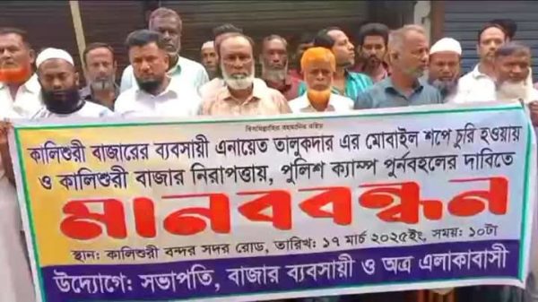 বাউফলে পুলিশ ফাঁড়ি পূর্ন স্থাপনের দাবিতে ব্যবসায়ীদের মানববন্ধন
