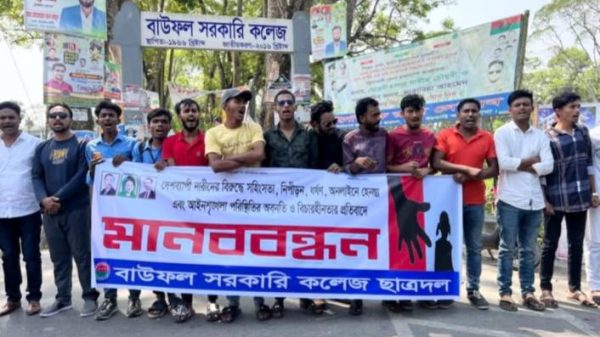 কহিনুর বেগম, পটুয়াখালী : পটুয়াখালী জেলার বাউফল উপজেলায় বাংলাদেশ জাতীয়তাবাদী ছাত্রদল কেন্দ্রীয় ঘোষিত দেশব্যাপী ধর্ষণ, নারীদের বিরুদ্ধে সহিংসতা, নিপীড়ন, অনলাইনে হেনস্তা এবং আইনশৃঙ্খলা পরিস্থিতির অবনতি ও বিচারহীনতার প্রতিবাদে মানববন্ধন করেছে