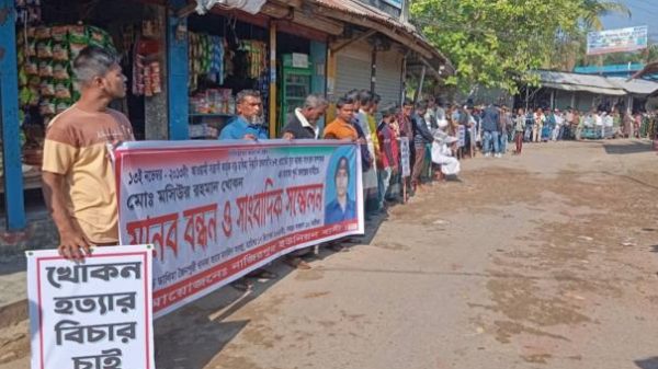কহিনুর বেগম, পটুয়াখালী : পটুয়াখালী জেলার বাউফল উপজেলায় মশিউর রহমান খোকন নামে এক যুবদল নেতা হত্যার বিচারের দাবিতে মানববন্ধন কর্মসুচী পালন করেছেন এলাকাবাসী। মঙ্গলবার সকাল ১০ টায় উপজলার কালাইয়া-বড়ডালিমা ব্রিজ