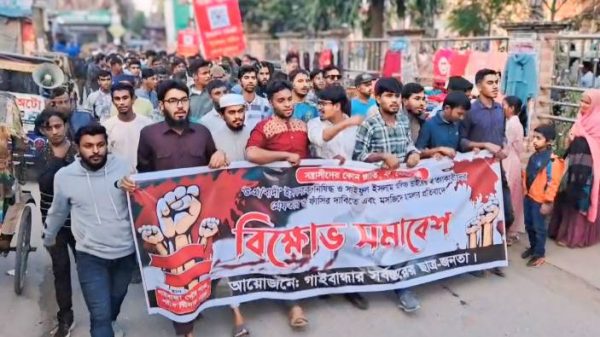 ওবাইদুল ইসলাম, গাইবান্ধা : উগ্রবাদী সংগঠন ইসকন নিষিদ্ধ, আইনজীবী সাইফুল ইসলাম আলিফ হত্যাকারীদের দ্রুত গ্রেপ্তার ও ফাঁসির দাবিতে এবং মসজিদে হামলার প্রতিবাদে গাইবান্ধায় বিক্ষোভ মিছিল অনুষ্ঠিত হয়েছে। গাইবান্ধার সর্বস্তরের ছাত্র
