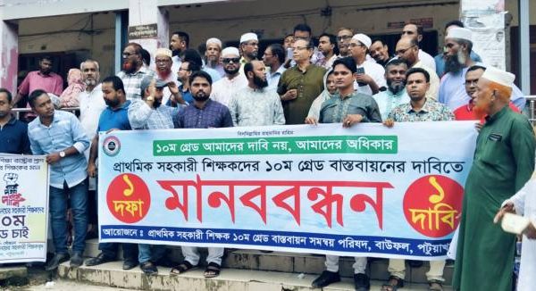 কহিনুর বেগম,পটুয়াখালী: পটুয়াখালী জেলার বাউফল উপজেলায় প্রাথমিক সহকারী শিক্ষকদের ১০ম গ্রেড বাস্তবায়নের এক দফা দাবিত মানববন্ধন কর্মসুচী পালন করেছেন প্রাথমিক বিদ্যালয়ের শিক্ষকরা। ০১.১০.২৪ইং তারিখ রোজ মঙ্গলবার বিকল ৪ টার
