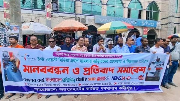 ফারহানা আক্তার, জয়পুরহাট : ইস্ট ওয়েস্ট মিডিয়া কমপ্লেক্সে সন্ত্রাসী হামলা, ভাঙচুর এবং তাণ্ডবের প্রতিবাদে মানববন্ধন ও প্রতিবাদ সমাবেশ করেছেন জয়পুরহাটের কর্মরত সাংবাদিকরা। বৃহস্পতিবার (২৯ আগস্ট) বেলা সাড়ে ১১ টায় শহরের