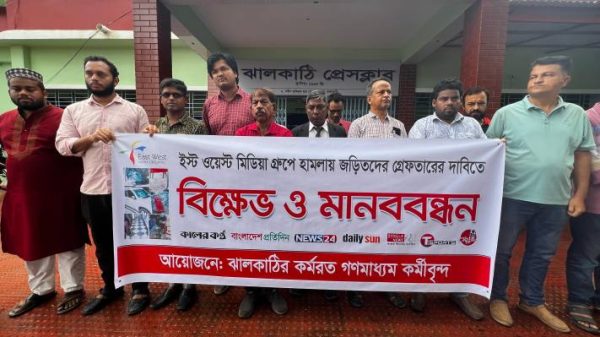 ইষ্ট ওয়েষ্ট মিডিয়া কমপ্লেক্সে হামলার প্রতিবাদে ঝালকাঠিতে সাংবাদিকের মানববন্ধন