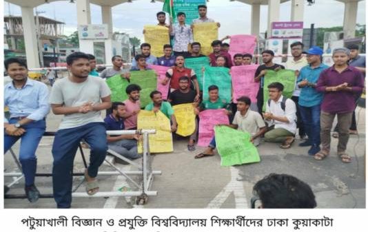 কহিনুর বেগম, পটুয়াখালী : সরকারি চাকরিতে অযৌক্তিক ও বৈষম্যমূলক কোটা বাতিল করে পদ্ধিত সংস্কারের স্থায়ী সমাধানের দাবিতে ঢাকা-কুয়াকাটা মহাসড়ক অবরোধ করেছেন পটুয়াখালী বিজ্ঞান ও প্রযুক্তি  বিশ্ববিদ্যালয়ের (প্রবিপ্রবি) শিক্ষার্থীরা। এতে সড়কের