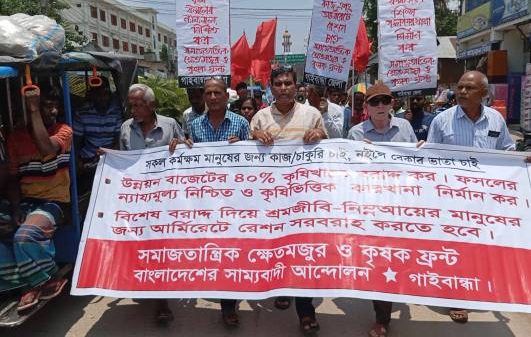 ওবাইদুল ইসলাম, গাইবান্ধা : উন্নয়ন বাজেটের ৪০ভাগ কৃষিখাতে বরাদ্দসহ বিশেষ বরাদ্দ দিয়ে সারাবছর শ্রমজীবি-নিম্ন আয়ের মানুষের জন্য আর্মিরেটে রেশন সরবরাহের দাবীতে গাইবান্ধায় সমাজতান্ত্রিক ক্ষেতমজুর ও কৃষকফ্রন্টের বিক্ষোভ। বৃহস্পতিবার সকালে সমাজতান্ত্রিক