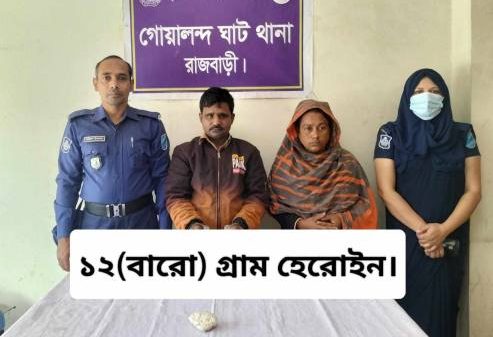 অরুণ রাহা, রাজবাড়ী : “চল যাই যুদ্ধে, মাদকের বিরুদ্ধে” এই প্রতিপাদ্যকে সামনে রেখে মাদকের বিরুদ্ধে জিরো টলারেন্স নীতিতে অভিযান করেছে গোয়ালন্দ ঘাট থানার পুলিশ। রাজবাড়ীর গোয়ালন্দে হেরোইনসহ স্বামী-স্ত্রী মোঃ আশরাফুল