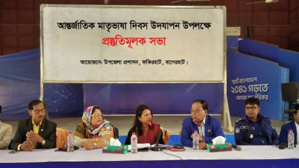 সেলিম শেখ, ফকিরহাট : ২১ শে ফেব্রুয়ারি শহীদ দিবস ও আন্তর্জাতিক মাতৃভাষা দিবস উদযাপন উপলক্ষে বাগেরহাটের ফকিরহাটে প্রস্তুতিমূলক সভা অনুষ্ঠিত হয়েছে। মঙ্গলবার উপজেলা প্রশাসনের উদ্যোগে উপজেলা পরিষদ মিলনায়তনে অনুষ্ঠিত সভায়