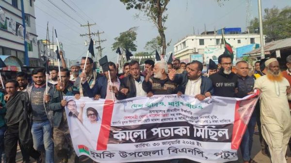 কহিনুর বেগম, পটুয়াখালী : পটুয়াখালী জেলার দুমকী উপজেলায় দ্রব্যমূল্যের ঊর্ধ্বগতি এবং ‘ডামি নির্বাচন’ বাতিলসহ সরকারের পদত্যাগের এক দফা দাবিতে কেন্দ্রীয় কর্মসূচির অংশ হিসেবে কালো পতাকা মিছিল করেছে উপজেলা বিএনপি ও
