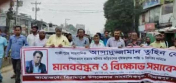 মোঃ সাইফুল ইসলাম, দিনাজপুর : গাজীপুরে সাংবাদিক আসাদুজ্জামান তুহিনকে প্রকাশ্য দিবালোকে নৃশংসভাবে হত্যার প্রতিবাদে এবং এ হত্যার ঘটনায় জড়িতদের শাস্তি ও বিচারের দাবিতে দিনাজপুরের বিরামপুরে মানববন্ধন ও বিক্ষোভ সমাবেশ অনুষ্ঠিত