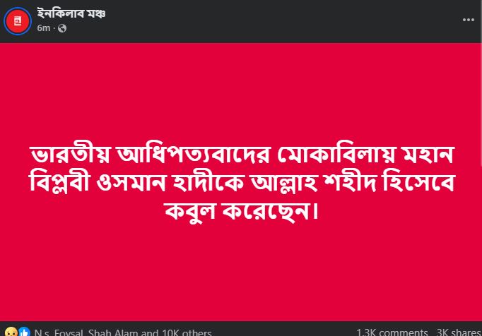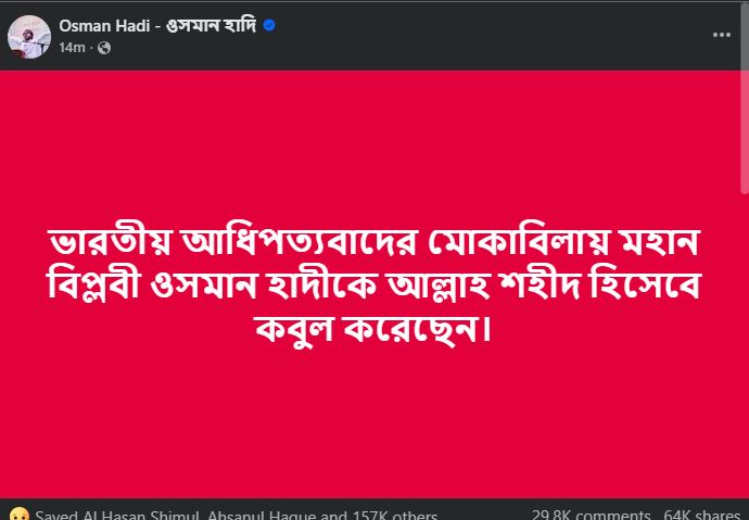 ওই পোস্টে বলা হয়, ‘ভারতীয় আধিপত্যবাদের মোকাবিলায় মহান বিপ্লবী ওসমান হাদিকে আল্লাহ শহীদ হিসেবে কবুল করেছেন।’
